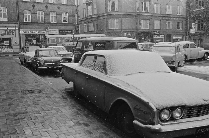 En snedækket Ford Fairlaine 500 på Gråbrødre Plads foran nr. 4, i baggrunden ses Gråbrødre Farve og Tapet, Jernbanegade 6, Fyens Turist Service, damefrisør Flodin og lædervareforrretning nr. 8, "Gråbrødrehus" nr. 12 med Vilh. Larsens Eftf. bog-og papirhandel, tobakshandler Thorving og Kaffecentrum. Der er tæt trafik og også bybus kører på Jernbanegade.
