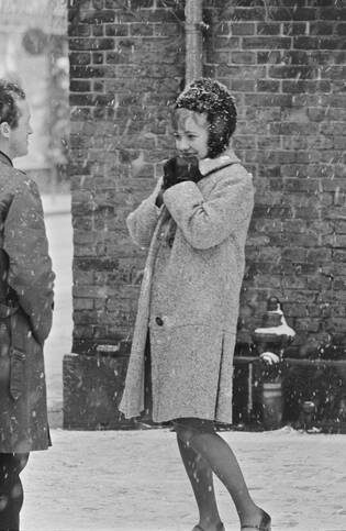 Den unge pige er klædt i vinterfrakke, tynde strømper, tyk hue.