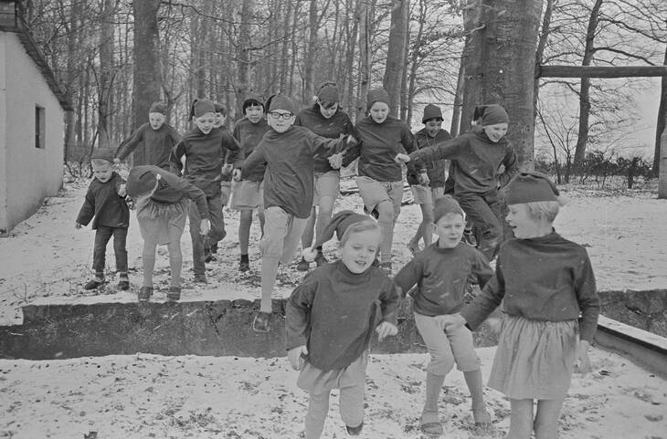 På Egeby Børnehjem laver man julestue for at samle ind til børnenes sommerferietur til Norge. Børnene er i dagens anledning klædt som nisser. Der skal være optræden af både børn og voksne indenfor, men først kan man jo lige tage en frisk løbetur ude i sneen.