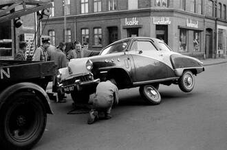 Føreren af en Studebaker fik sig i 1957 en slem forskrækkelse, da han svingede om hjørnet fra Krudthusgade til Dronningensgade i Odense, og bilens foraksel knækkede. Uheldet resulterede i, at det ene forhjul kom ind under bilen og hævede dens ene side i vejret, så den blev stående på de to hjul i højre side. Her er en redder fra Zonen i færd med at kigge nærmere på den brækkede foraksel.