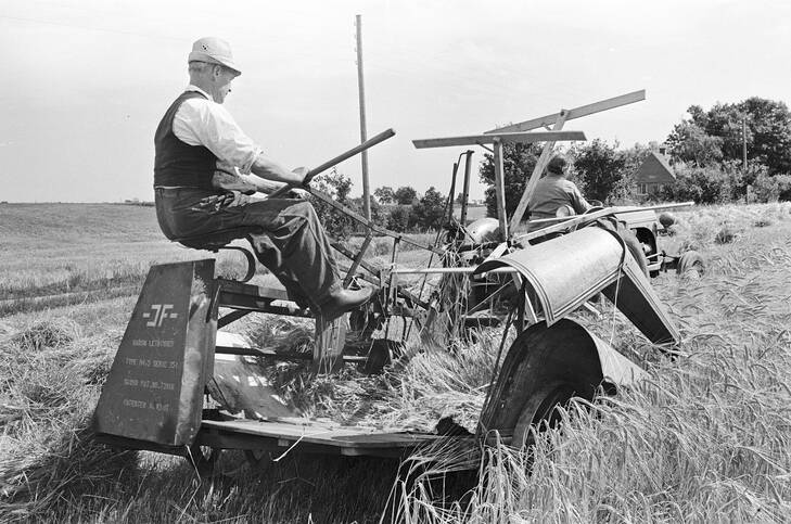 Husmand John Knudsen, Gamby, og hans hustru er blandt dem, der høster kornet med selvbinder. Konen kører traktoren, manden styrer letbinderen fra JF.
